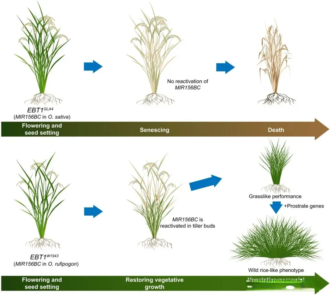 MIR156BC的重置介导了水稻从一年生向营养生长型多年生的转变。栽培水稻具有有限的生命周期,从开花结种到衰老,MIR156BC未被重新激活。在携带野生稻MIR156BC等位基因的栽培水稻中,MIR156BC在种子成熟后的节间分蘖芽中被重新激活,从而支持持续生长,并表现出类似禾草的性状,包括花序逆转和营养繁殖能力。进一步聚合匍匐生长基因后,植株转变为类似野生的形态,支持营养多年生生长。