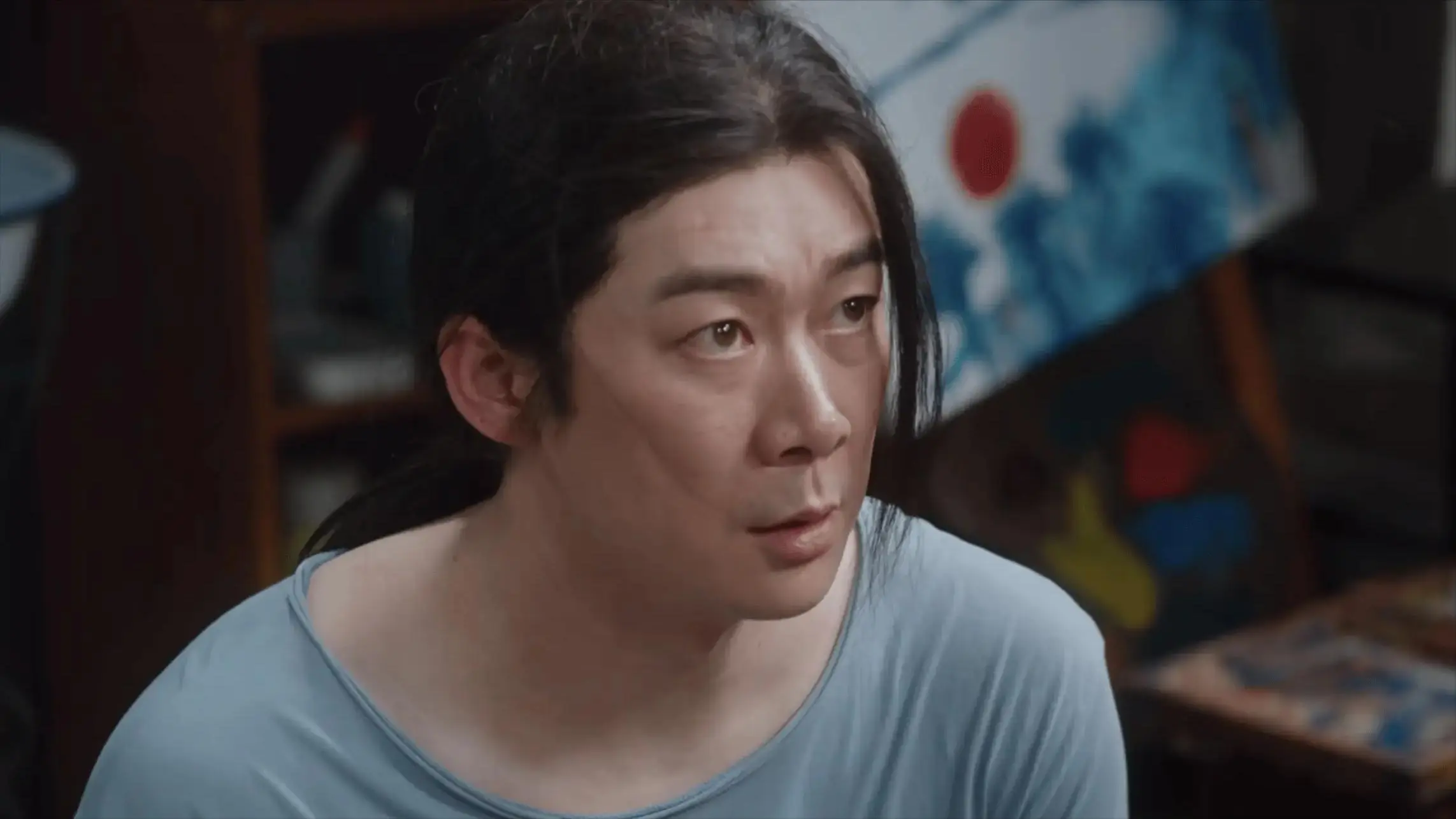 最典型的就是他和假画老板正面冲突的那场戏,剧情到了那里本该是全场情绪最激烈的节点之一,一个年轻画家发现自己的作品被仿冒、被利用,那种愤怒和委屈应该是爆发性的。