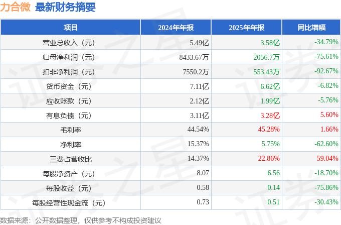 据证券之星公开数据整理,近期力合微(688589)发布2025年年报。截至本报告期末,公司营业总收入3.58亿元,同比下降34.79%,归母净利润2056.7万元,同比下降75.61%。按单季度数据看,第四季度营业总收入8806.96万元,同比下降48.44%,第四季度归母净利润-181.3万元,同比下降105.33%。本报告期力合微三费占比上升明显,财务费用、销售费用和管理费用总和占总营收同比增幅达59.04%。