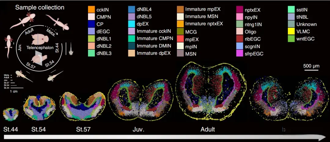 蝾螈的大脑再生能力,一直令科学家们惊叹。它能够在遭受损伤后,重新生成失去的脑组织,这一现象为人类大脑修复提供了极具启发性的线索。2022年,研究团队使用时空组学技术Stereo-seq,成功绘制了首个高分辨率的蝾螈端脑再生时空图谱。