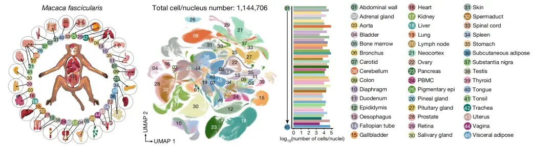 食蟹猕猴45个组织或器官114万个细胞的“地图”,“地图”上113种颜色代表着113种细胞类型