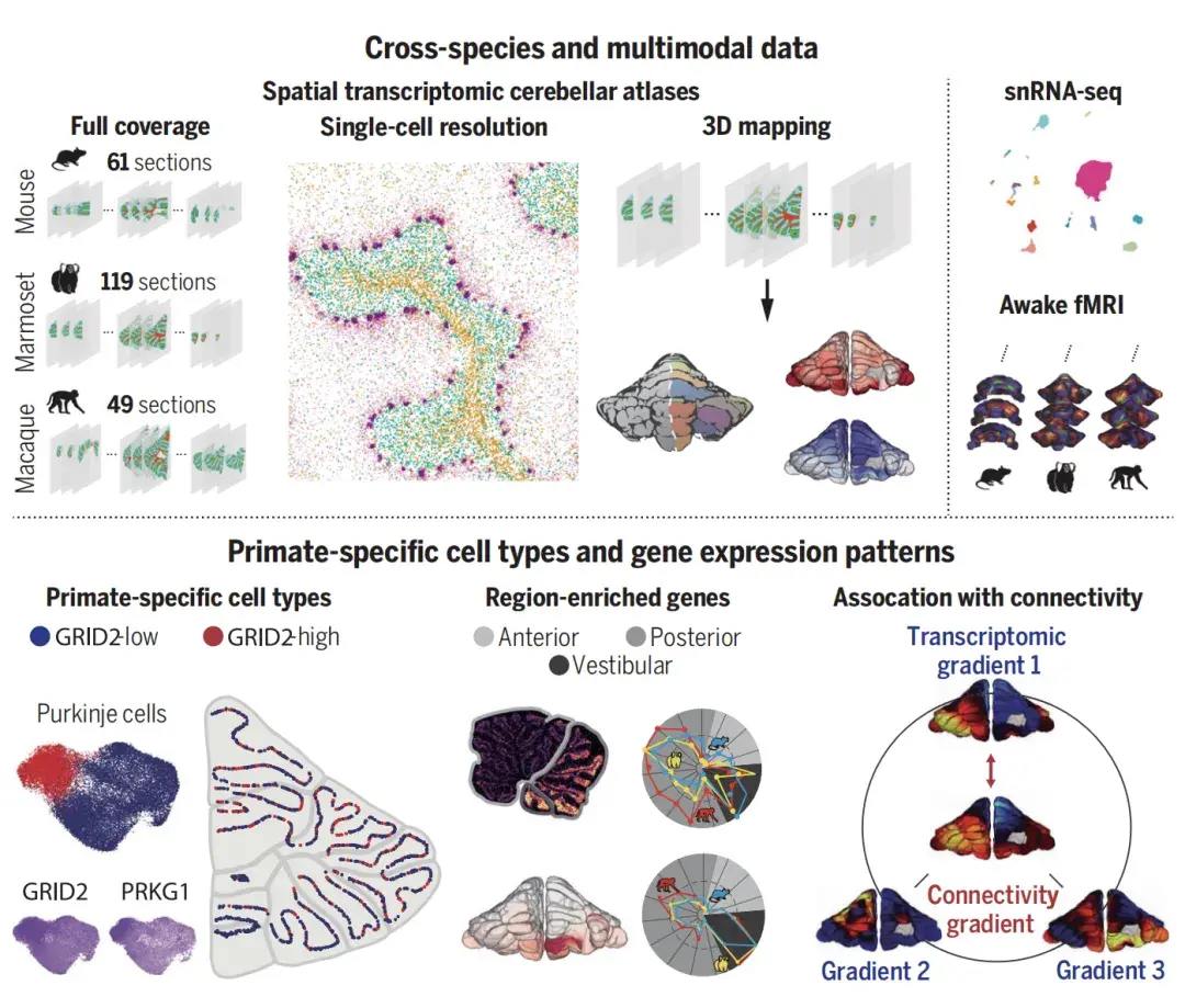 小脑是大脑中负责协调运动、平衡和学习的关键区域,其在不同物种中的结构和功能差异极为显著。2024年,研究团队突破性地完成了猕猴、狨猴和小鼠的小脑空间转录组图谱。这一图谱不仅揭示了小脑内细胞的种类、基因表达模式及其空间分布,还为小脑相关疾病的研究提供了新的方向。