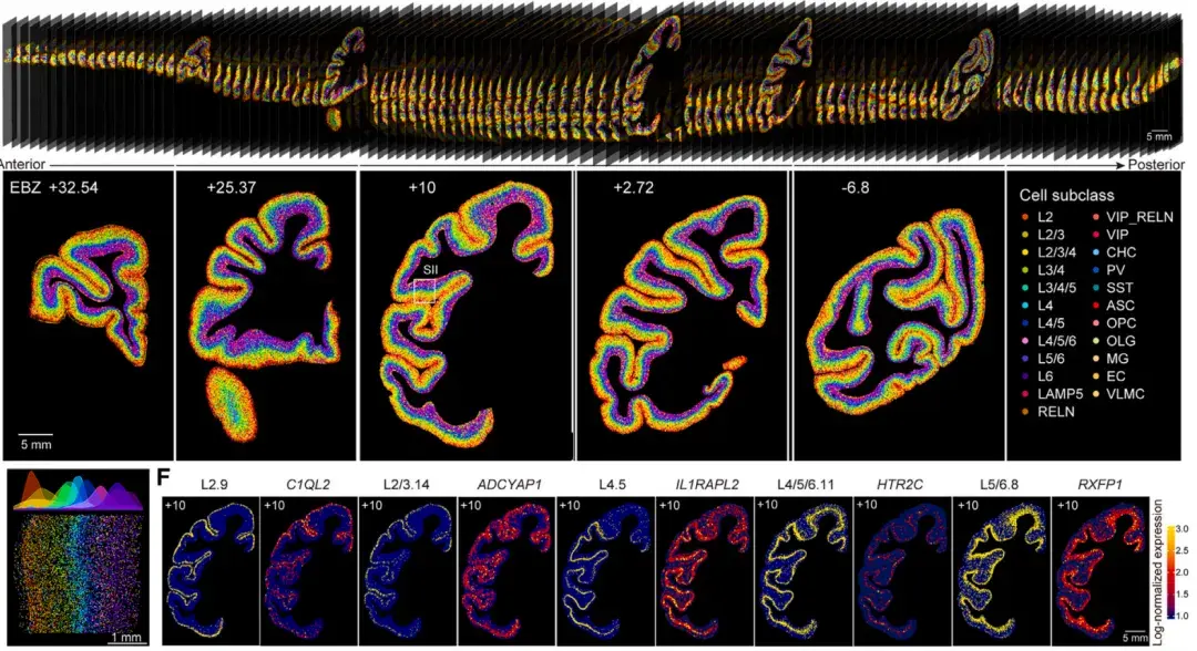 2025年,研究团队发布了小鼠全脑的单细胞空间转录组图谱。其一大亮点是成功识别了神经元亚型在空间中的分布特征。例如,研究人员在小鼠脑干运动核团中发现了不同类型的运动神经元亚型,为运动控制的分子机制研究提供了宝贵的线索。此外,小鼠全脑图谱还揭示了部分非神经元细胞在大脑不同区域的富集特征,进一步扩展了我们对大脑细胞分布和功能多样性的理解。