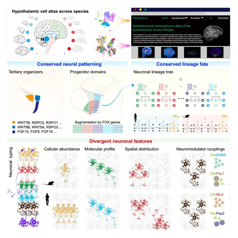 下丘脑作为调控代谢、睡眠和情绪的核心枢纽,在不同物种中展现出独特的进化特征。2025年,研究团队创新性地构建了人类、猕猴和小鼠的下丘脑发育时空图谱。这项研究不仅系统解析了下丘脑细胞的类型组成、基因表达动态和空间定位特征,更为代谢性疾病和精神障碍的研究开辟了新途径。