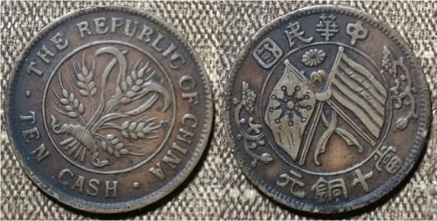 这类双旗币的核心特征:正面为交叉双旗图案,上方为“中华民国”四个大字,下方为“当十铜元”面值;背面为嘉禾图案,环绕着英文“THE REPUBLIC OF CHINA”,字体工整,纹路清晰,但边缘依然有轻微的毛刺。
