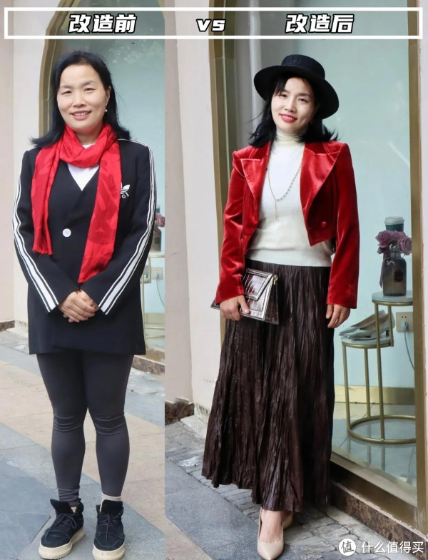 配色是穿衣打扮中的一门必修课,不会打扮的女人往往不懂得拿捏配色关系,以至于让色彩看起来杂乱无章,基础色与亮色系搭配在一块很不和谐。经过改造后,将亮色系有条不紊的分布在上中下3个位置,如红色打底叠穿米色马甲大衣,下半身搭配米色半裙配红色袜子,并加以红色包包点缀,配色呼应更能强调整体层次感。