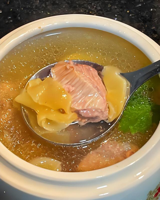 9. 完成并盛出:炖煮至汤色清透,排骨熟烂,鱼胶软糯,汤味浓郁。捞出姜片和其他杂物,盛出汤即可享用。