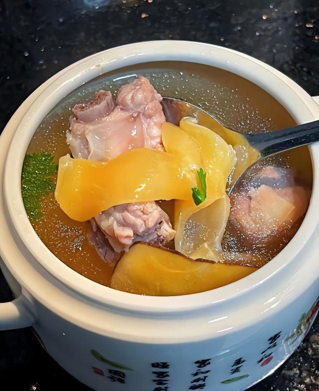 6. 慢炖汤底:将炖锅加热,煮沸后撇去浮沫,然后转小火慢慢炖煮1.5小时。保持小火炖煮,让鱼胶和排骨的营养成分充分释放。