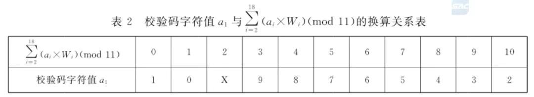 为了方便计算,国家标准中直接给出了校验码a1和余数的换算关系对应表: