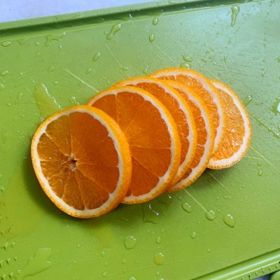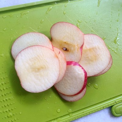 步骤2、橙子和苹果用食盐搓洗一下,去掉表面的灰尘和果蜡。苹果切成薄片。