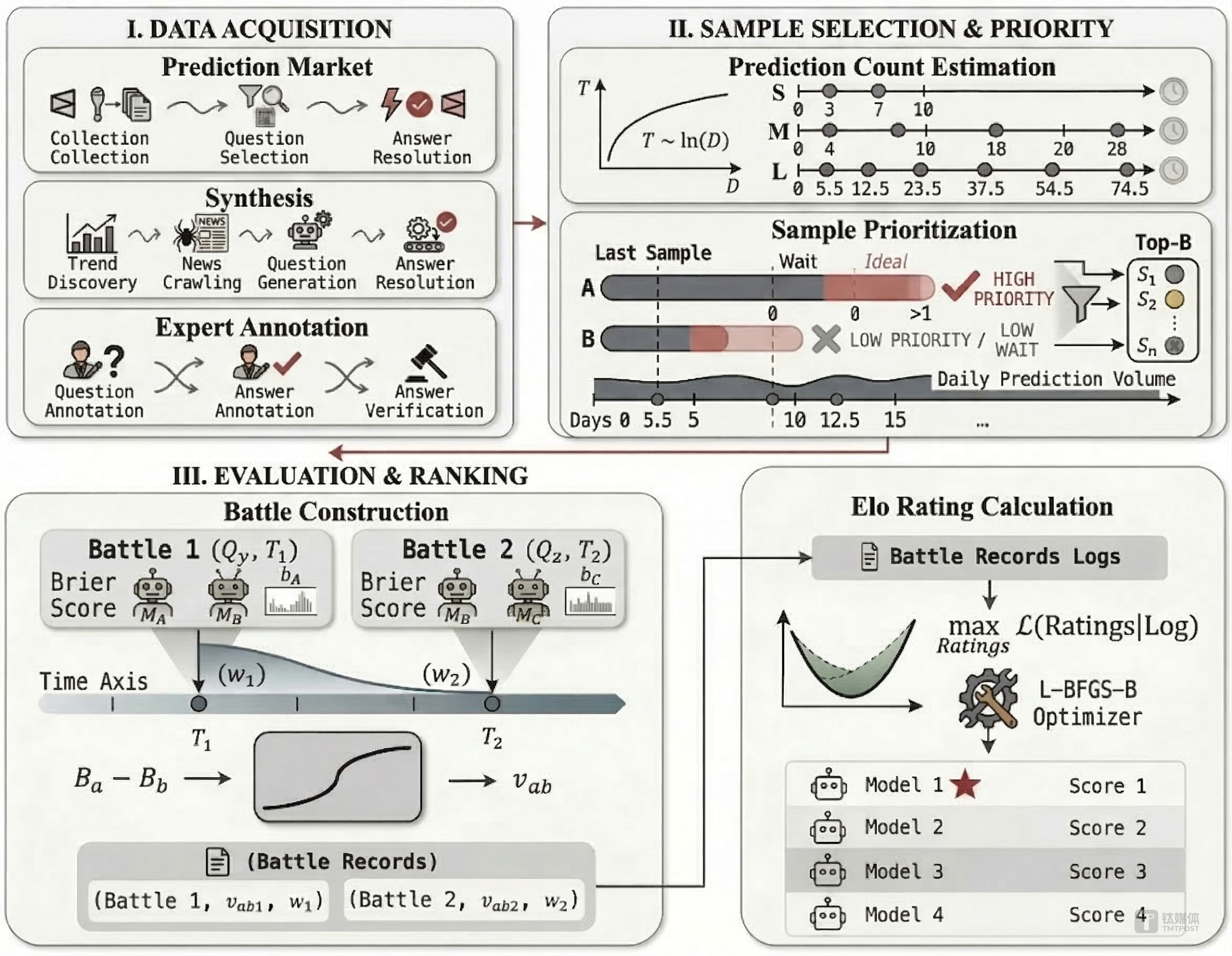 第三阶段为对战构建,采用 point-aligned Elo 机制,严格只比较"同一道题、同一预测时间点"的结果,以解决时序不对称问题。