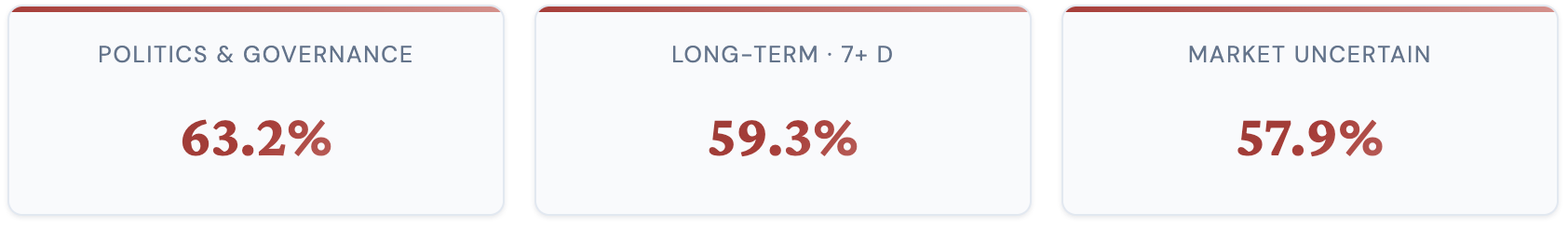 在与 Polymarket 人类交易市场的直接对比中,UniPat AI 公布了一组分层数据:在政治与治理领域,EchoZ-1.0 胜率为 63.2%;在预测期限超过 7 天的长期预测中,胜率为 59.3%;在人类信心区间为 55%-70% 的市场不确定场景中,胜率为 57.9%。