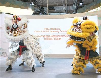 演员在2026柏林国际旅游交易会中国展区表演舞狮。 新华社记者 张豪夫摄
