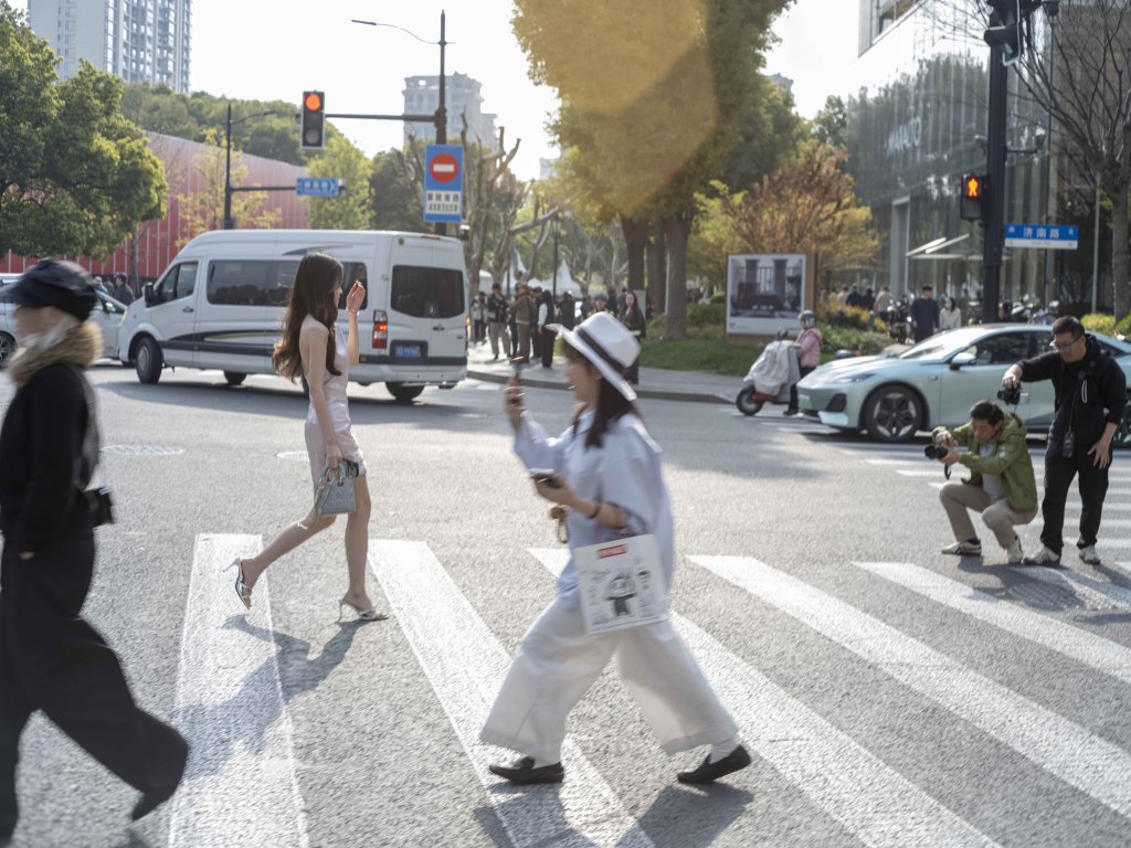 2026年3月29日,上海时装周秀场外。T台秀结束后,不少时尚人士在斑马线上切磋。澎湃新闻记者 许海峰 图