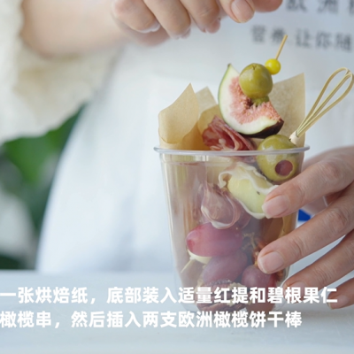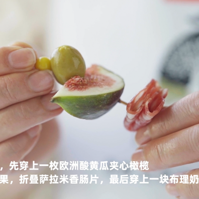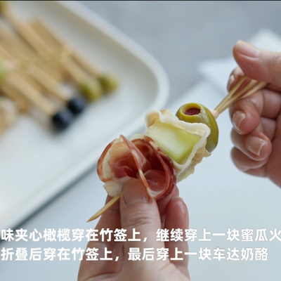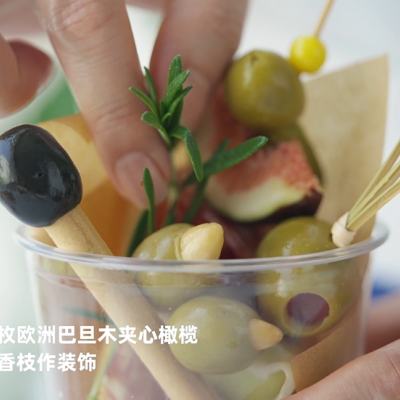 火腿干酪无花果和橄榄这些西式冷盘元素穿串,装入分享纸杯,火腿咸香搭配蜜瓜和无花果,干酪奶香碰撞橄榄回甘,指尖捏碎果核咸香,阳光正穿透青果皮囊。