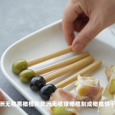 步骤4、饼干棒穿入欧洲无核黑橄榄和欧洲无核绿橄榄制成橄榄饼干棒。