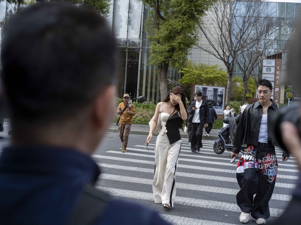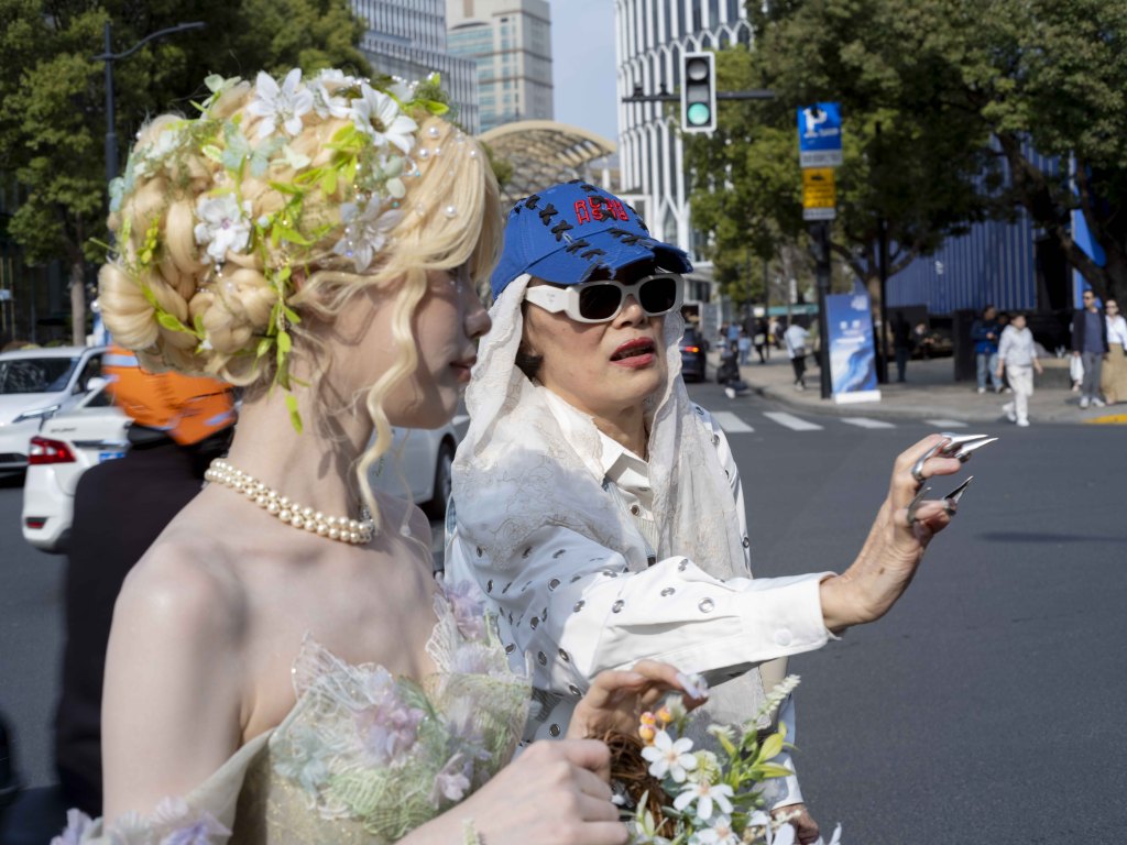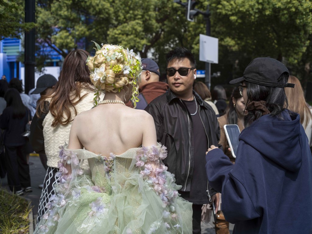 2026年3月29日,上海时装周秀场外。T台秀结束后,不少时尚人士在斑马线上切磋。澎湃新闻记者 许海峰 图