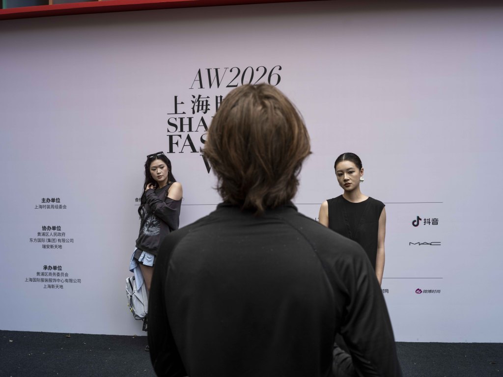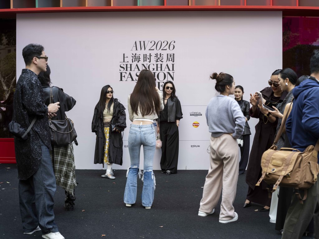 2026年3月29日,上海时装周秀场外。受邀嘉宾在背景墙前留影。澎湃新闻记者 许海峰 图