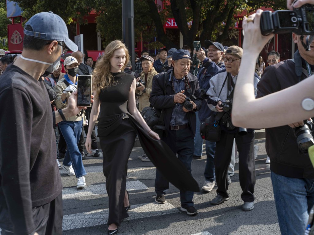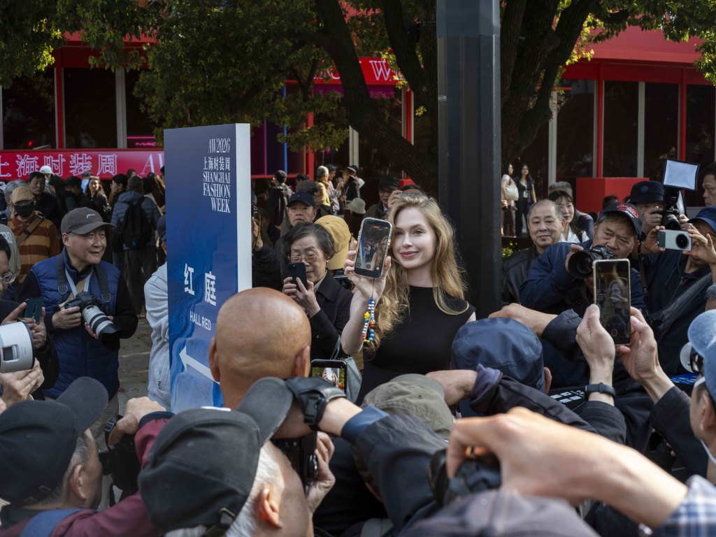 2026年3月29日,上海时装周秀场外。一名外籍女子被围观拍摄。澎湃新闻记者 许海峰 图