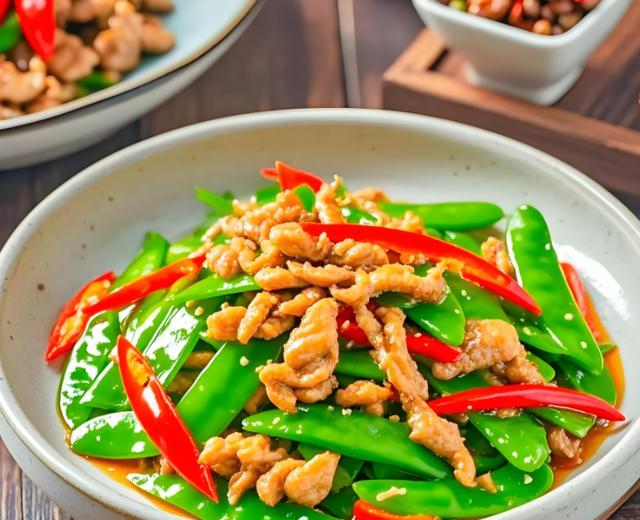 材料:荷兰豆 200克;瘦肉(猪肉或牛肉)150克;姜蒜 适量;红椒 1个;生抽 适量;料酒 适量;盐 适量;食用油 适量