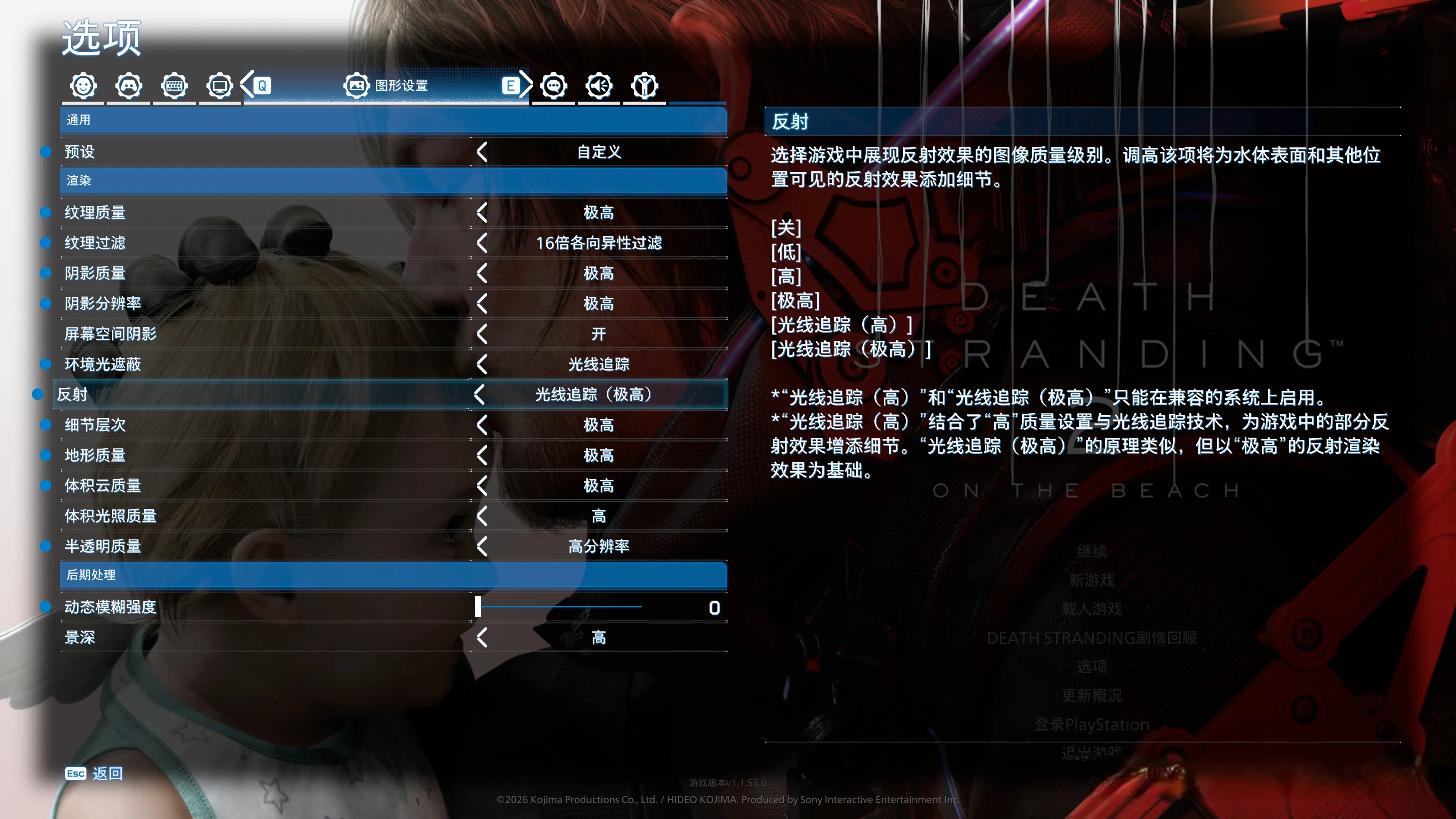 《死亡搁浅2》预设画质分为便携、低、中、高和极高五档,极高档不是真正的满特效,反射还是高而不是极高,可能是因为极高档边际收益递减明显。具体来看,本作相比前作增添不少可调特效,比如体积云质量、细节层次、半透明质量等等,PC平台上还独家支持光线追踪(环境光遮蔽和反射),并没有直接无脑上路径追踪,确实也是主机游戏常见的克制做法。