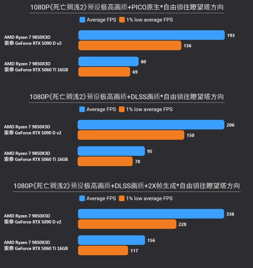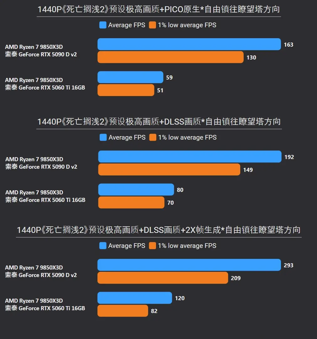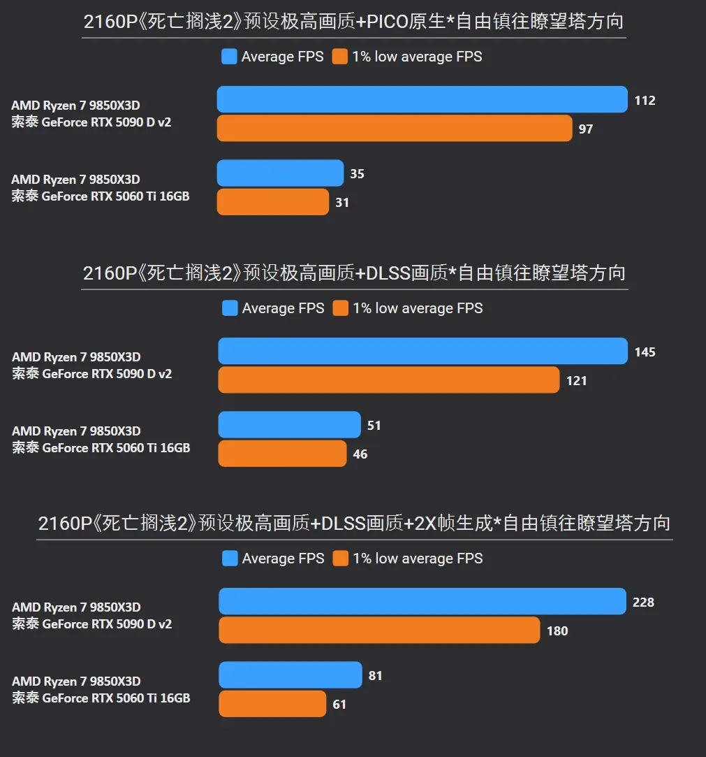 就本次测试的两款显卡来看,RTX 5060 Ti 16GB已经能满足2K最高光栅画质+PICO原生达到平均60fps,在此基础上开启光追,则需要开启DLSS降低压力之后达到平均58fps就可胜任。