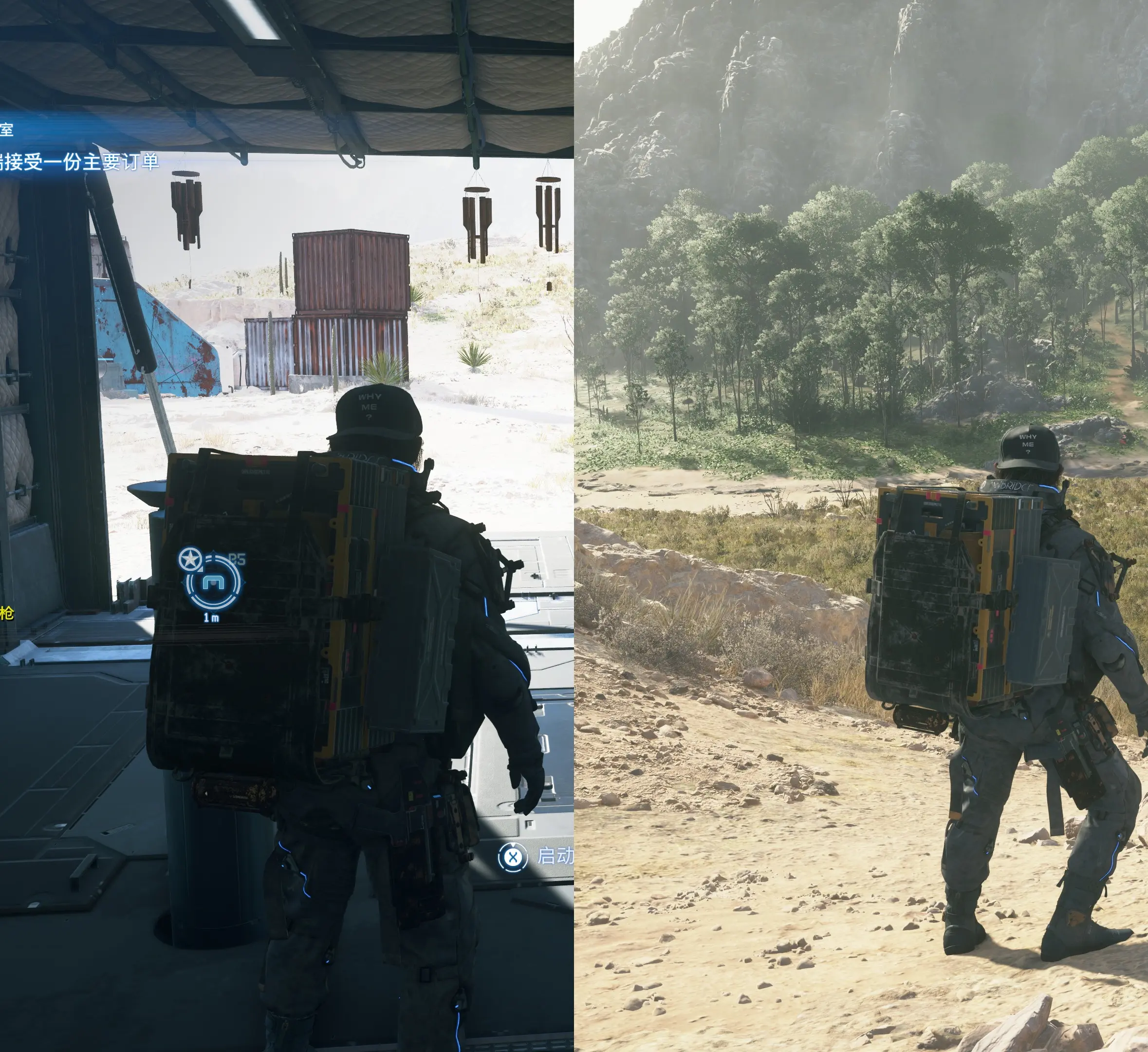 具体测试方法,由于《死亡搁浅2》未提供基准程序,因此只能手动挑选一条相对固定的路线测试的。经过硬核仔细考量,最终把起点定在自由镇的终端机处,直线往前跑至不远处的森林区域,进入森林后结束测试,整体流程比较符合玩家游玩习惯,单次测试时长约50秒左右,该路线强度能代表玩家绝大部分游玩时间所能接触到的,具有实际参考意义。