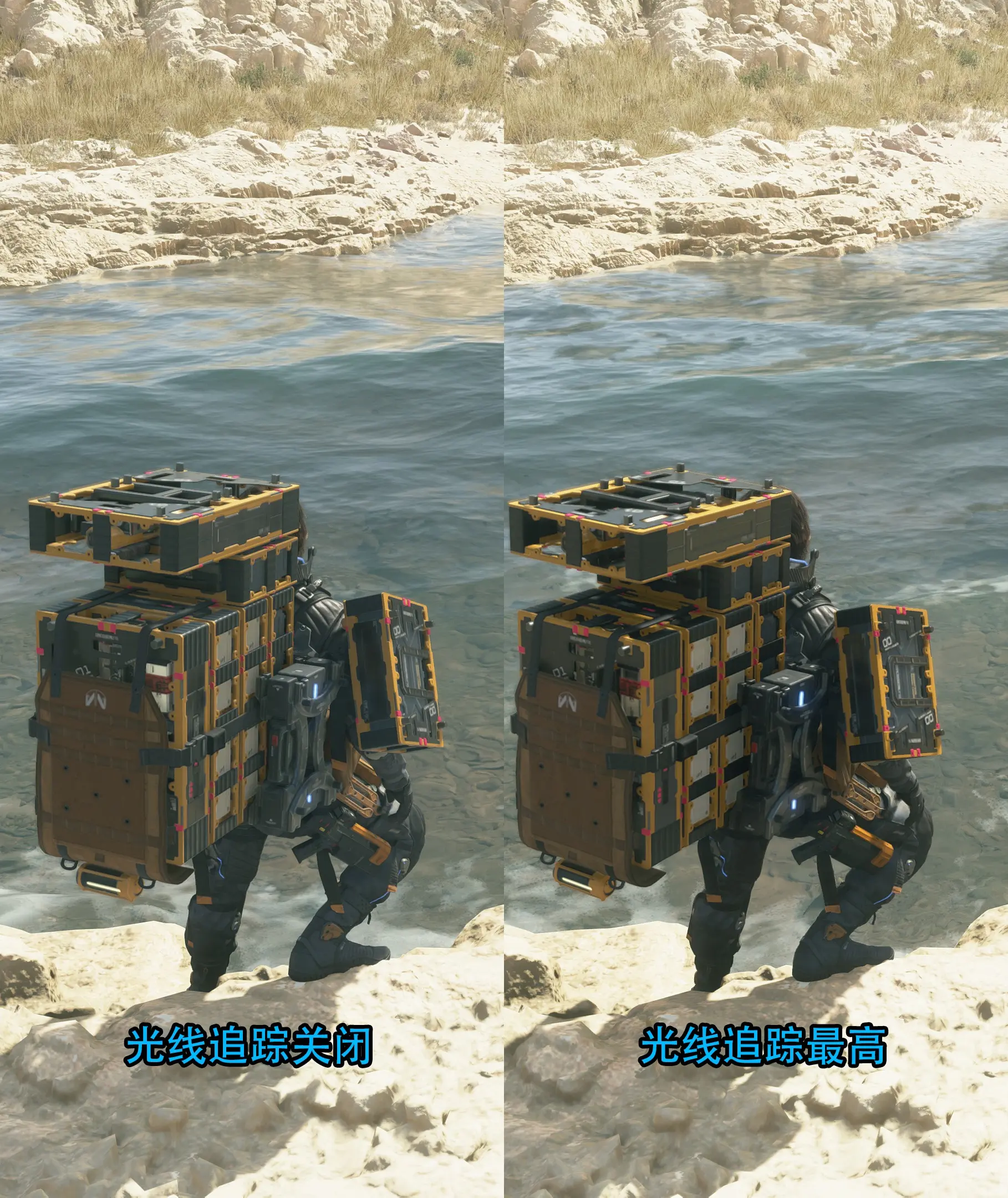 光线追踪在《死亡搁浅2》野外环境中仅算是锦上添花,光追反射通常只在时间雨降下、靠近河流或金属物体时效果才较为明显,而光栅化下的反射表现已经足够出色。相比之下,光追环境光遮蔽的适用场景要广泛得多,只要有光照,物体就必然存在遮蔽区域;更重要的是,它的性能开销极小,而反射效果虽然开销较大,实际应用频率却不高。