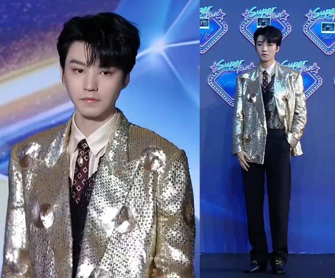 王俊凯穿了一件金色亮片西装搭配酒红色领带,无论是金色的外套还是金、红的配色,对他来说都有些成熟了,仿佛借了爸爸年轻时的衣服来穿。