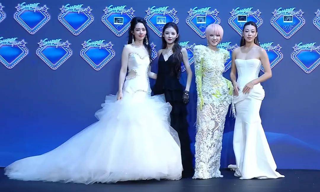 由郭碧婷、张予曦、刘忻、蔡诗芸四人组成的摇滚女团ROLLING SISTERS,造型看起来不太像一个团的。郭碧婷穿了一条长拖尾白色抹胸长裙,就像女明星出席时尚盛典;张予曦穿的是黑色吊带长裙,就像女明星出席品牌活动;刘忻的妆造最抢镜,像即将登上演唱会舞台的歌手;蔡诗芸则像为好姐妹海岛婚礼当伴娘的女生。