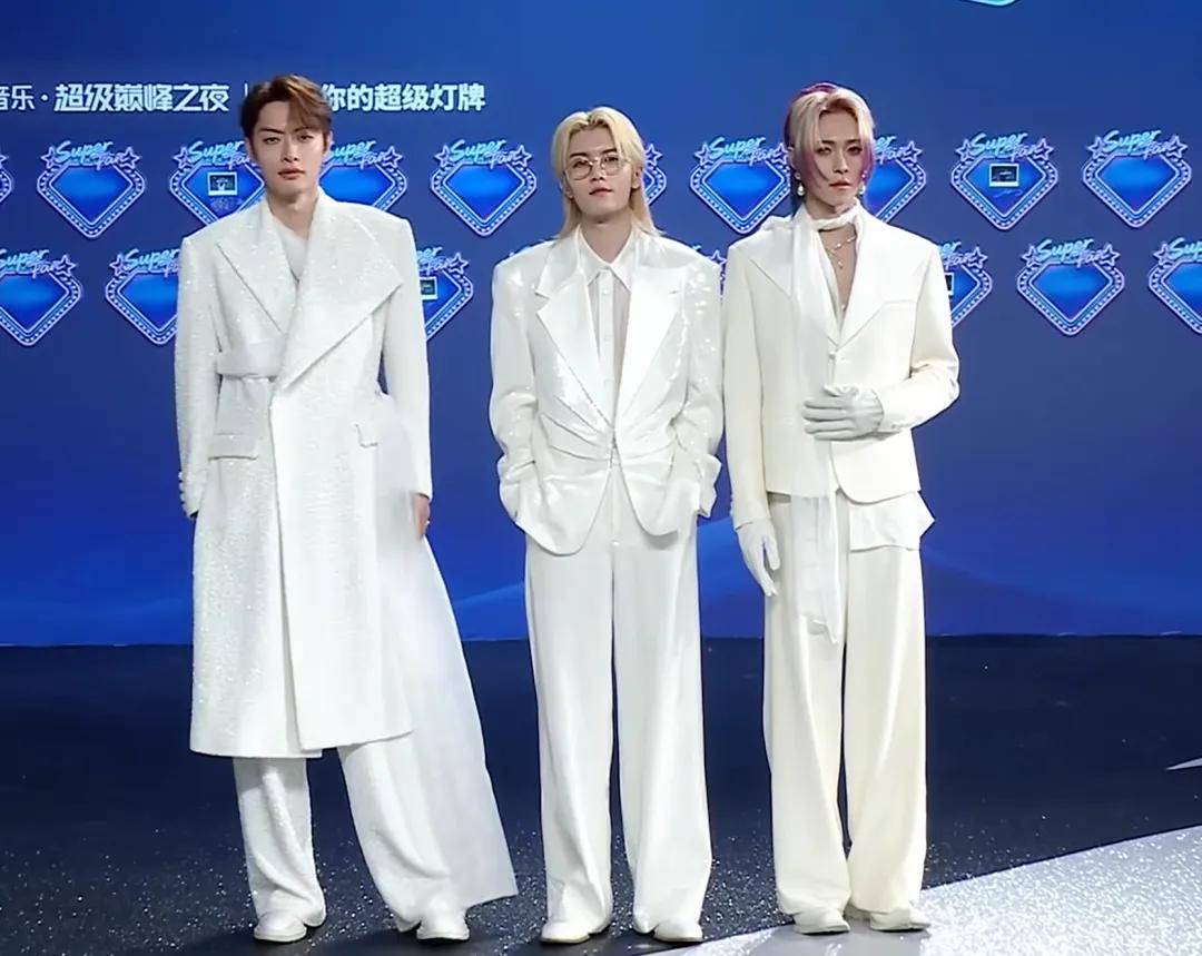 男团ONER默契地穿了白色西服,神奇的是三人都穿出了不一样的感觉,左边的木子洋像秀场模特,中间的灵超像出席颁奖礼的爱豆,右边的岳岳像……