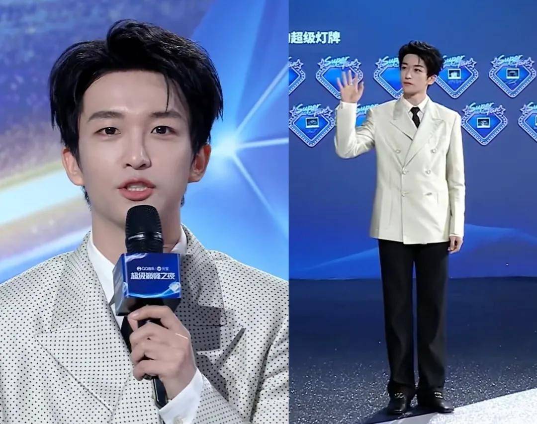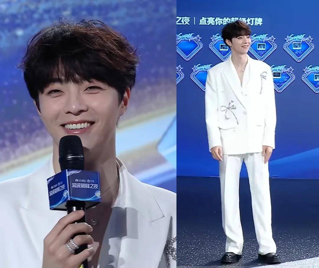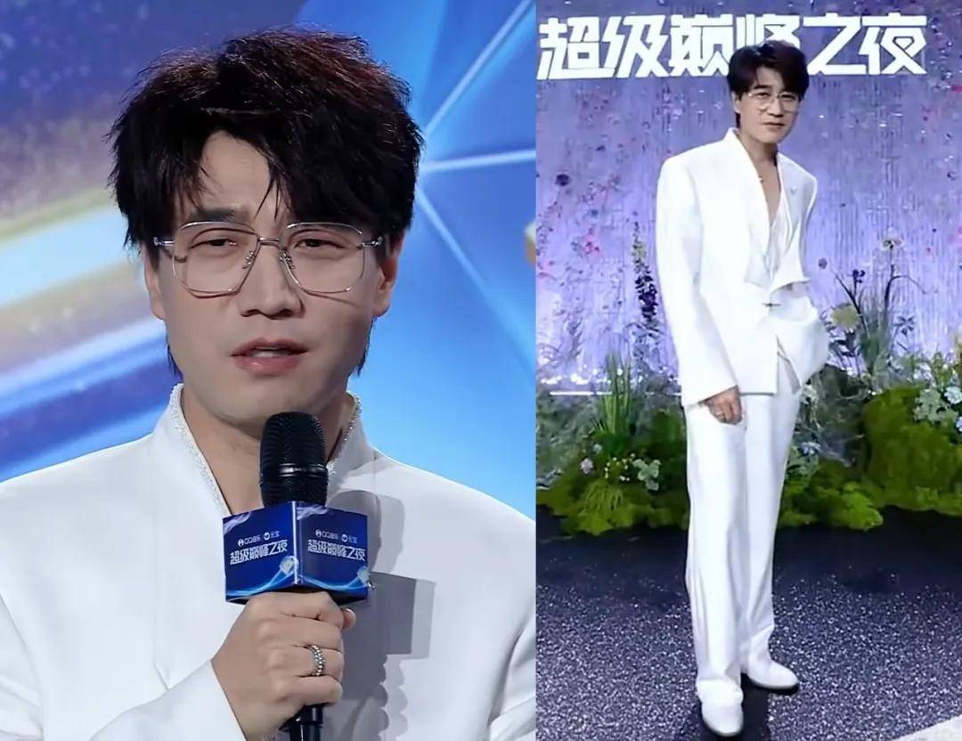 王铮亮穿了一套白色西服,搭配银框眼镜,整体妆造风格比十几年前显年轻多了。
