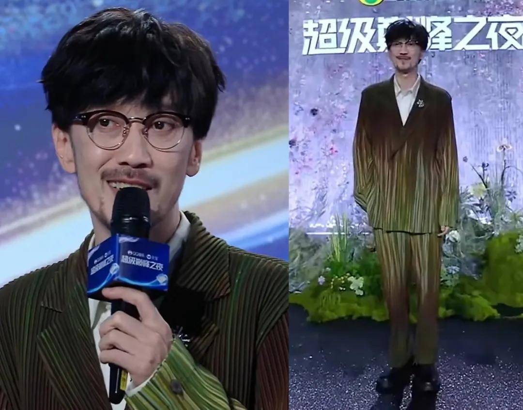 周传雄穿了一套咖色、绿色渐变的休闲西装套装,结合背景板的花草来看,越看越像一束在海底起舞的海带。