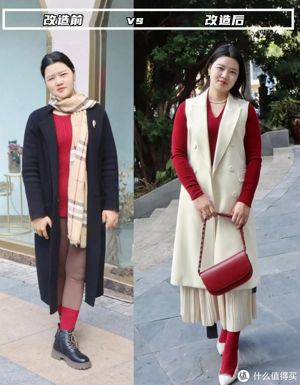 配色是穿衣打扮中的一门必修课,不会打扮的女人往往不懂得拿捏配色关系,以至于让色彩看起来杂乱无章,基础色与亮色系搭配在一块很不和谐。经过改造后,将亮色系有条不紊的分布在上中下3个位置,如红色打底叠穿米色马甲大衣,下半身搭配米色半裙配红色袜子,并加以红色包包点缀,配色呼应更能强调整体层次感。