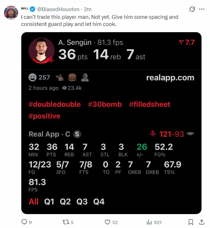 北京时间3月30日,NBA常规赛,火箭大胜鹈鹕拿到二连胜。这场比赛火箭在第二节打出39-18的攻防浪潮,下半场火箭的防守有所下滑但还是牢牢掌控比赛局势,最终申京拿到36+14+7+3+3的数据帮助球队拿下胜利。