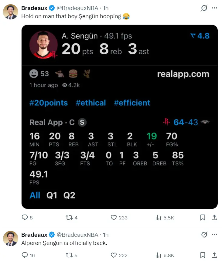 第二节申京8分钟里6中4,三分3中3,罚球4中3,拿到14分5篮板4助攻3抢断1盖帽,半场16分钟10中7+三分3中3拿到20分8篮板3助攻3抢断2盖帽,正负值+19。休媒Bradeaux:申京正式归位了。