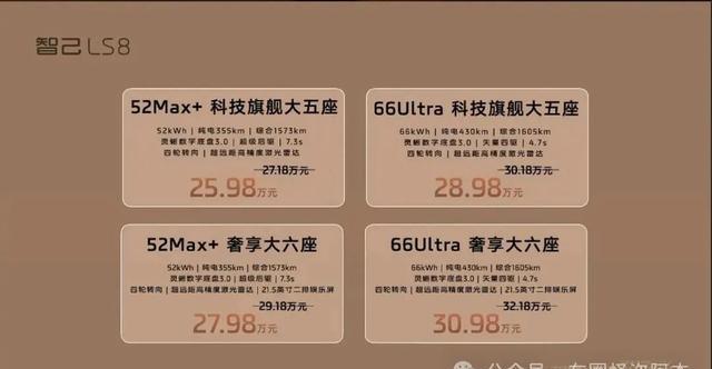 · 智己LS8 52 Max+科技旗舰大五座——预售价格:25.98万元起· 智己LS8 66 Ultra版科技旗舰大五座——预售价格:28.98万元起· 智己LS8 52 Max+奢享大六座——预售价格:27.98万元起· 智己LS8 66 Ultra 奢享大六座——预售价格:30.98万元起四款车型覆盖了从城市通勤到长途自驾、从二人世界到三代同堂的全场景需求,用户只需根据座位数(大五座/奢享六座)和续航里程(52度/66度)做出选择,旗舰配置已全系拉满。