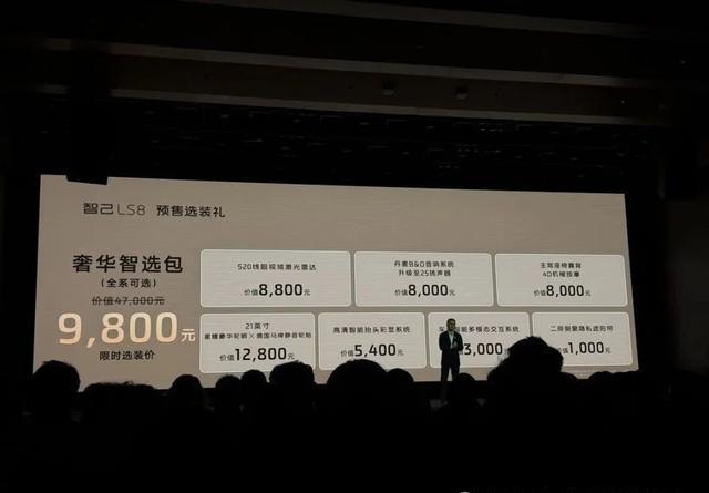 针对追求极致体验的用户,智己LS8还推出了“满配尊选包”,将多项顶级配置打包,预售限时优惠价仅需9,800元(总价值47,000元)。