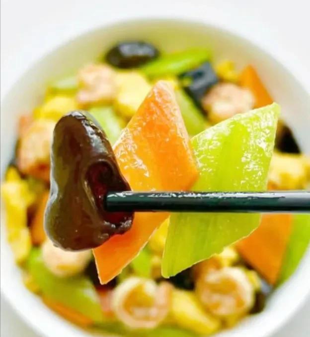 准备食材:胡萝卜、木耳、鸡蛋、黄瓜、虾仁。