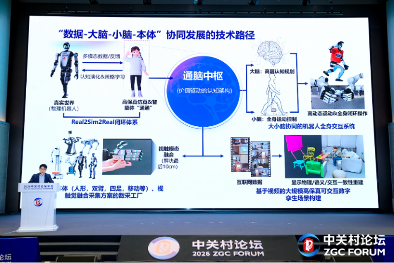 入选2026中关村论坛重大成果的“通脑”,是通研院推出的具身智能、机器人核心引擎,旨在打通通用智能体与物理机器人的双向通路,通过构建“数据-大脑-小脑-本体”协同发展的技术路径,推动具身机器人从“遥控演示”迈向具备自主决策、持续学习和跨场景泛化能力的“通用阶段”。