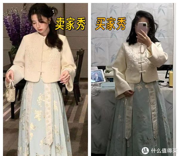 新中式服装带有鲜明的国风元素,如盘扣、印花、刺绣等,同时还搭配了鲜艳的颜色,光看着确实养眼,但实际穿上身后,对比卖家秀的区别就很明显了。