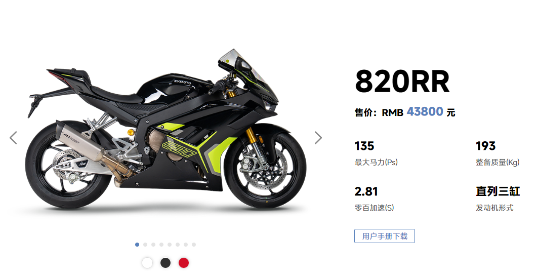 公司官网显示,目前张雪机车有ZX820RR、ZX500RR、ZX500F三款车。其中ZX820RR版售价43800元。另有公开信息显示,820RR开启预订后12个小时,累计锁单达1986台。