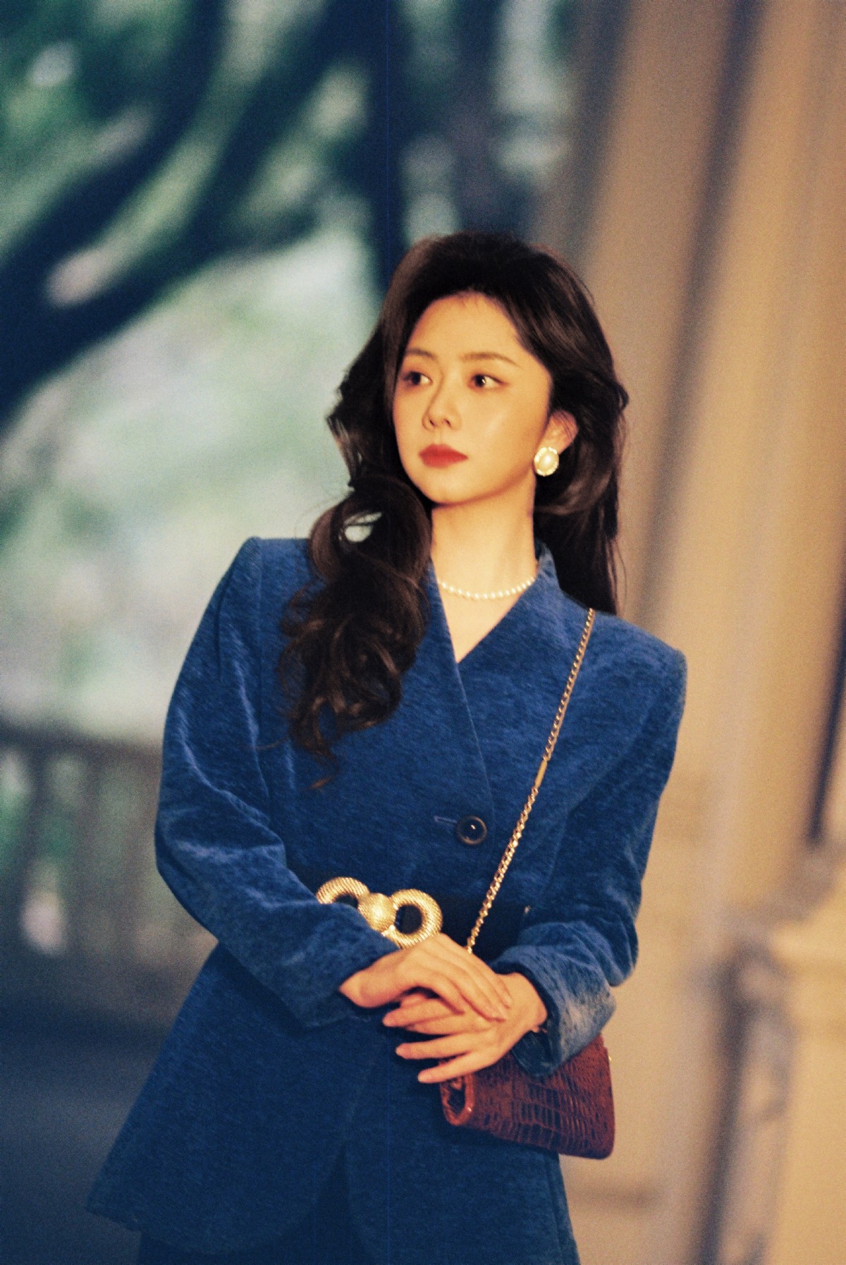 谭松韵的灯芯绒西装造型则尽显大气优雅,深邃的宝蓝色衬得她气质温婉,腰间的金属扣腰带勾勒出利落线条,珍珠项链与圆形耳环点缀其间,大波浪卷发随动作轻扬,既有职场女性的干练,又带着复古名伶的温婉,眼神里藏着故事感。