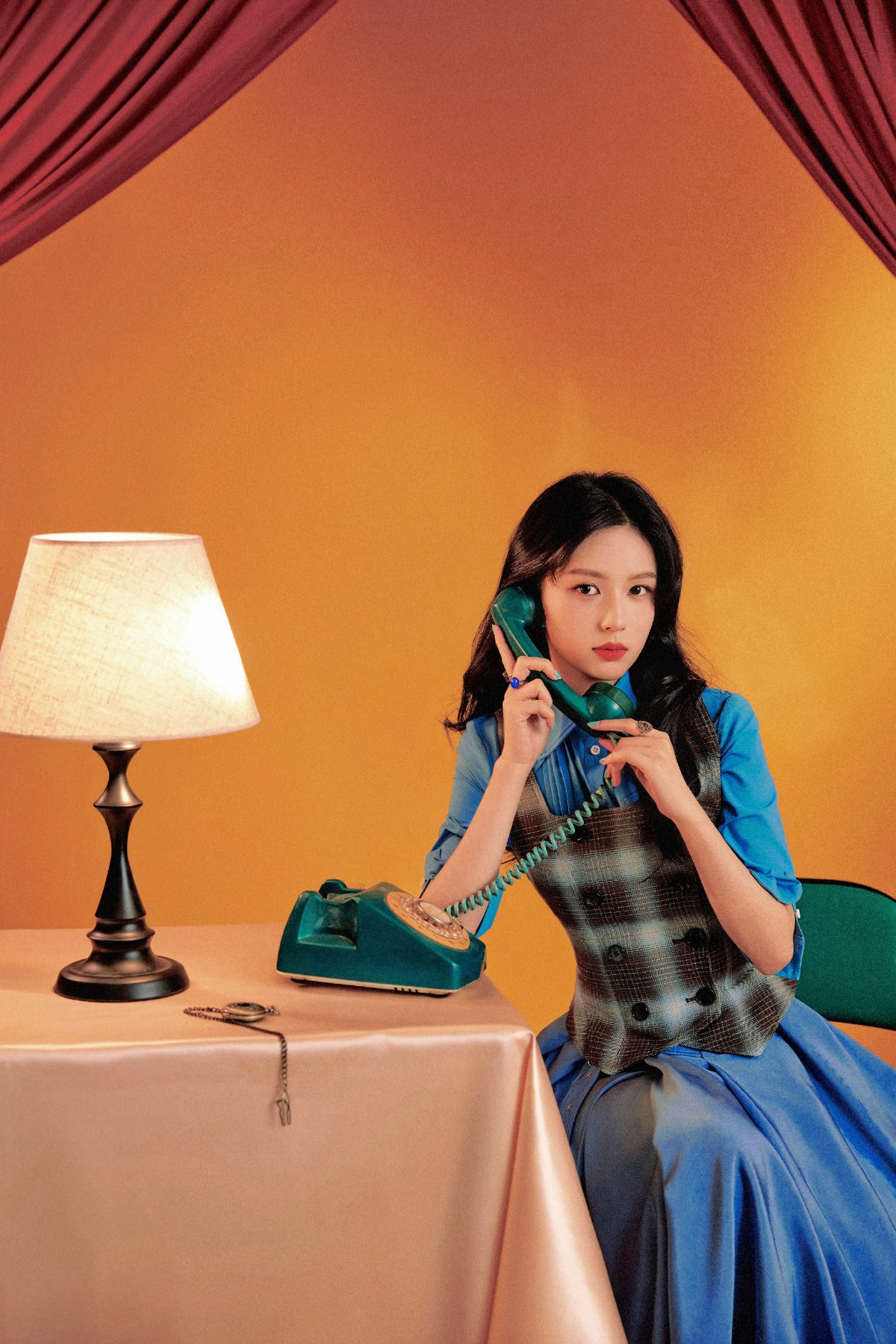 周也则偏爱更具年代感的港风穿搭,宝蓝色衬衫外搭格纹马甲,手持复古电话,暖橙背景与丝绒窗帘衬得她眉眼精致,仿佛下一秒就要拨通跨越时光的电话,诉说旧时光里的心事。