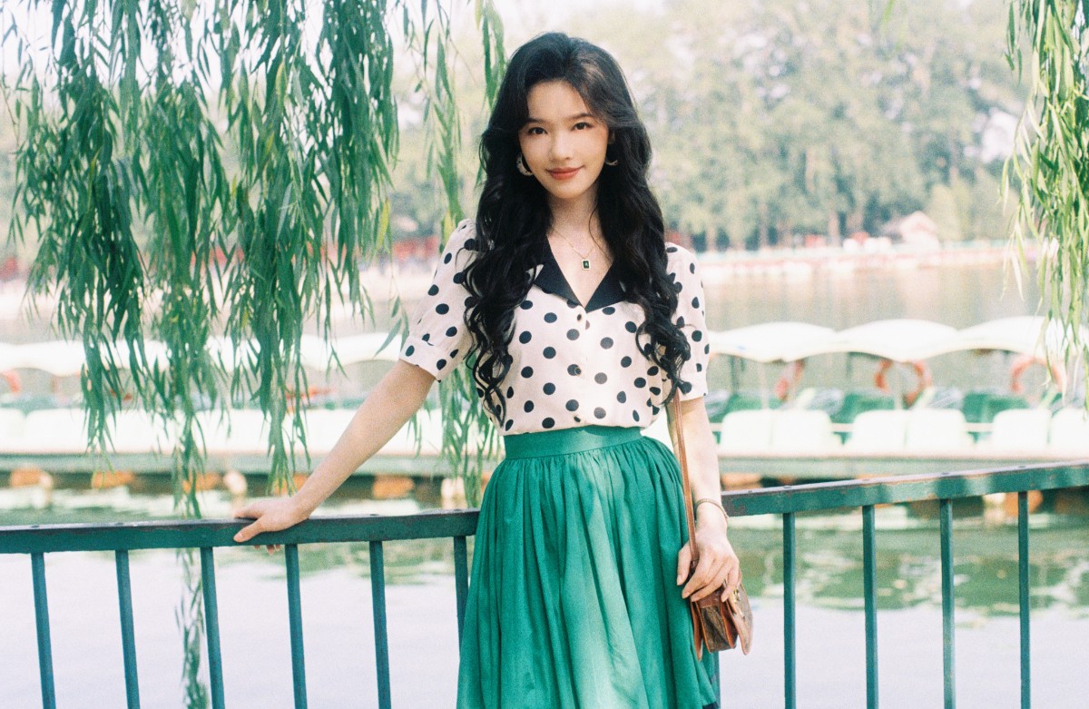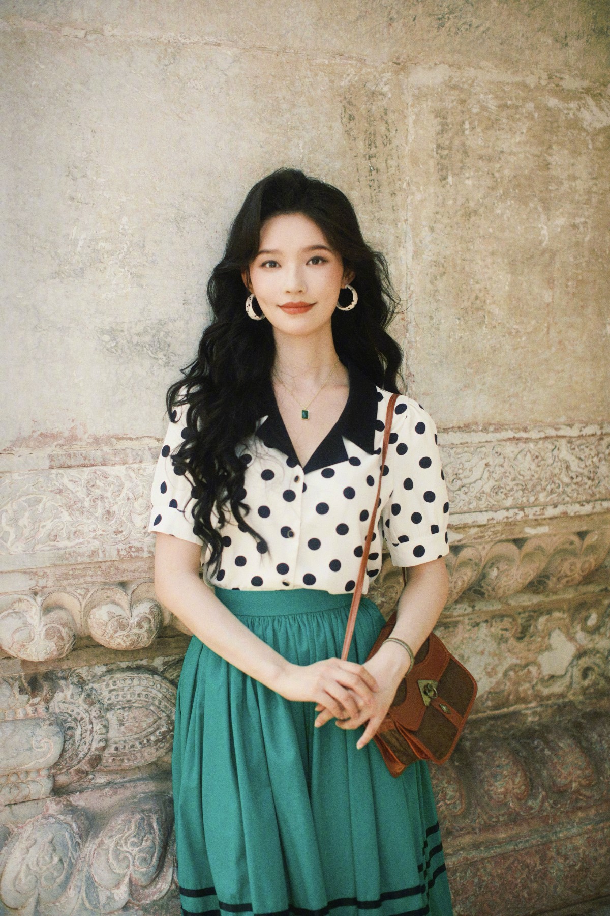 林允的复古造型带着清新的文艺感,黑白波点衬衫搭配墨绿百褶裙,大波浪卷发慵懒垂落,耳畔的圆环耳环与颈间的绿宝石项链相互呼应,站在斑驳的石墙前,像极了旧画报里的邻家少女,温柔又灵动。