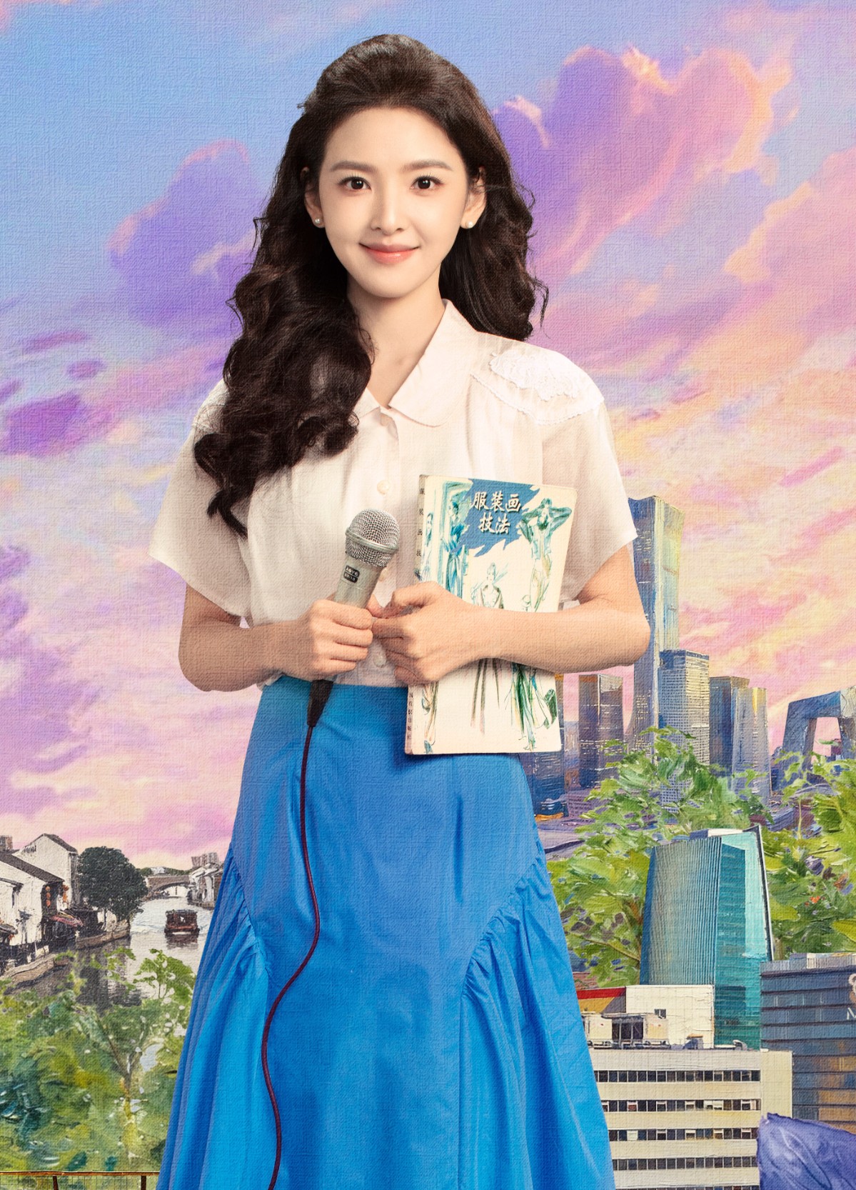 章若楠的造型则偏向清新的年代感,白色蕾丝翻领衬衫搭配亮蓝半身裙,手持话筒与旧书,温柔的卷发与明媚的笑容,像极了那个年代里热爱生活、追逐梦想的女孩,干净又充满力量。