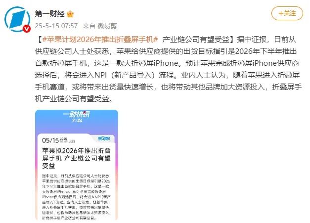 市场分析认为,若苹果真正推出可折叠设备,预计将对全球折叠屏产业链带来显著拉动作用。