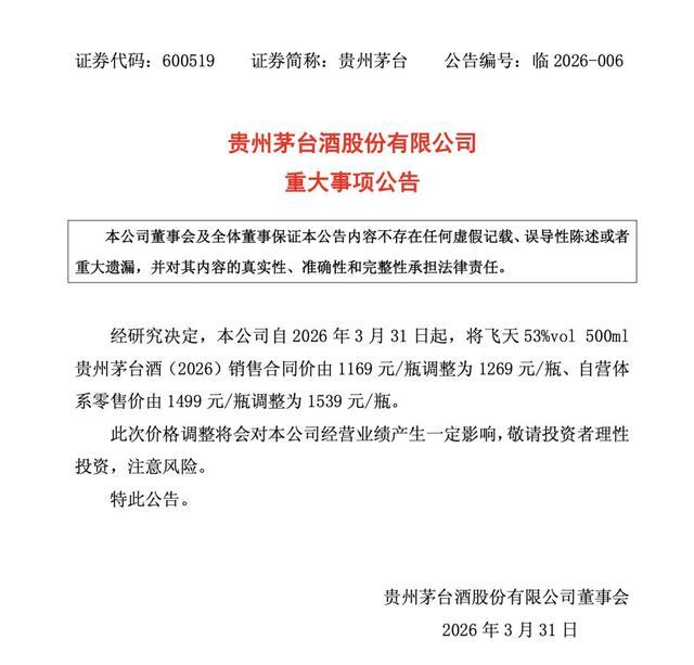 3月30日晚,贵州茅台酒股份有限公司发布重大事项公告称,自2026年3月31日起,将飞天53%vol500ml贵州茅台酒(2026)销售合同价由1169元/瓶调整为1269元/瓶、自营体系零售价由1499元/瓶调整为1539元/瓶。