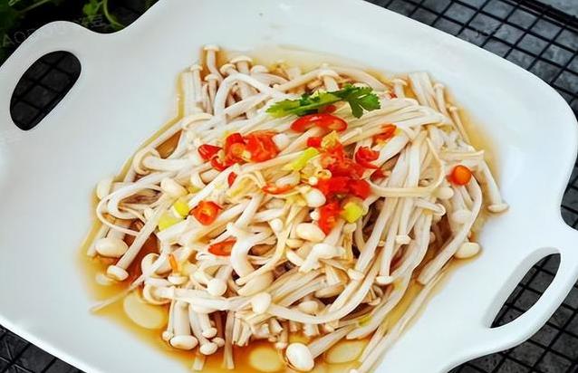 凉拌金针菇做法简单,金针菇去根洗净烫熟捞出。小米椒和干辣椒切小圈,蒜和葱切细放在金针菇上,加酱油、黑醋和盐。热油倒入辣椒圈,关火后快速淋在葱蒜上。金针菇爽脆,辣油香味四溢,酸辣开胃,很适合夏天吃。