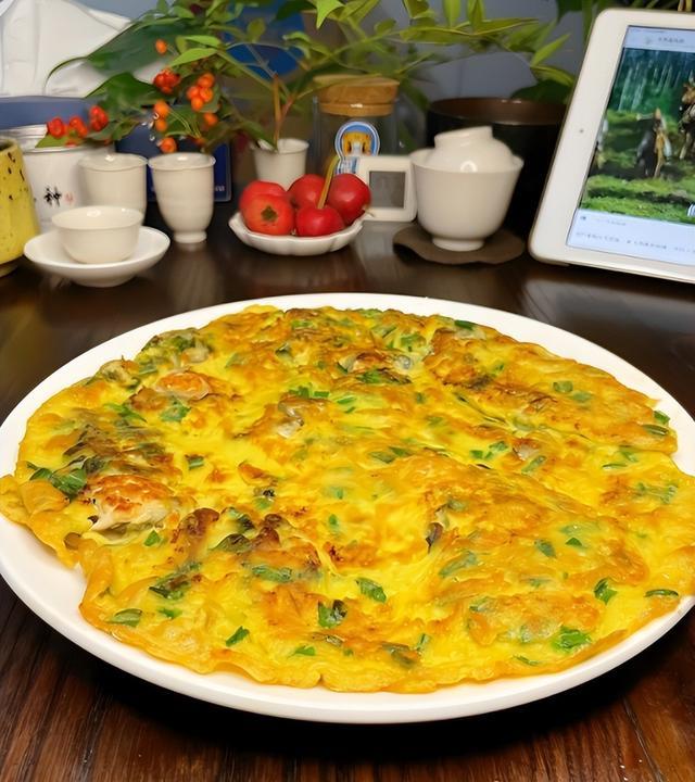 6. 煎蛋:用同一个锅,加入适量油,油热后将搅拌均匀的鸡蛋液倒入锅中,稍微定型后,加入之前炒好的海蛎。轻轻翻动锅,让蛋液均匀分布。